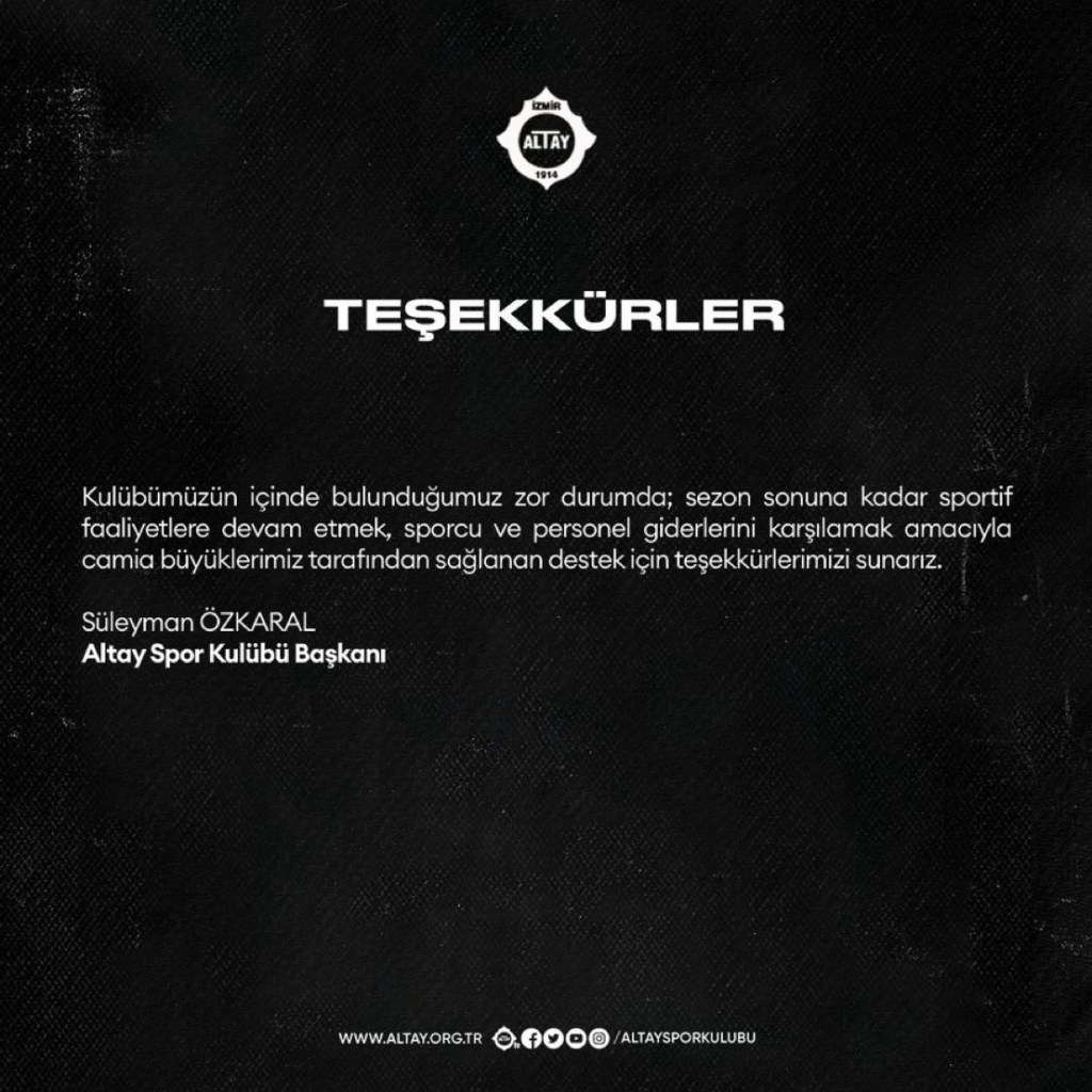 Kulübümüzün İçinde bulunduğumuz zor durumda; sezon sonuna kadar sportif faaliyetlere devam etmek, sporcu ve personel giderlerini karşılamak amacıyla camia büyüklerimiz tarafından sağlanan destek için teşekkürlerimizi sunarız. Süleyman ÖZKARAL Altay Spor Kulübü Başkanı
