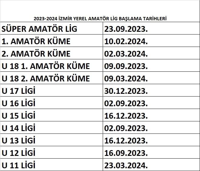 İzmir Süper Amatör Ligi 1.Amatör Lig 2.Amatör Lig U11 U12 U13 U14 U15 U16 U17 U18 8 Temmuz 2024 Sona Erecek.