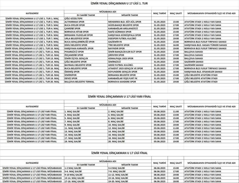 ”İzmir Yenal Dinçakman U17 ligi grup Maçlardan ilk 3‘te bitirerek İzmir Finalleri Play-Off Maçlardan katılmaya hak kazandığınız için tebrik ederim. Play -Off’a kalan takımlarımızın eşleşmelerinin belirleneceği kura çekimi Yarın 12:00’da İzmir ASKF binası Yapılacak. 1.TUR Maçları 31.05.2023 Çarşamba Yarı Final Maçları 03.06.2023 Cumartesi Final Maçları 06.06.2023 Salı Oynanacak.” Dedi.