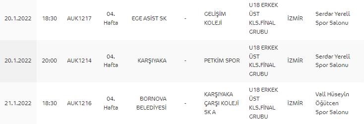 U18 Üst Klasman Final Grubu 3.Hafta Toplu Sonuçlar Boğaziçi Koleji-Ege Asist 63-57 Karşıyaka Belediyespor-Pınar 61-68 Gelişim Koleji-Bornova Belediyespor 69-68 Karşıyaka Çarşı Koleji-Petkimspor 79-84Gelişim Koleji Lider Halen Devam Ediyor. 3 Galibiyet 6 Puan Toplandı.4.Hafta 20 Ocak 18.30 Ege Asist-Gelişim Koleji 20.00 Pınar Karşıyaka-Petkimspor 21 Ocak 18.30 Bornova Belediyespor-Karşıyaka Çarşı Koleji