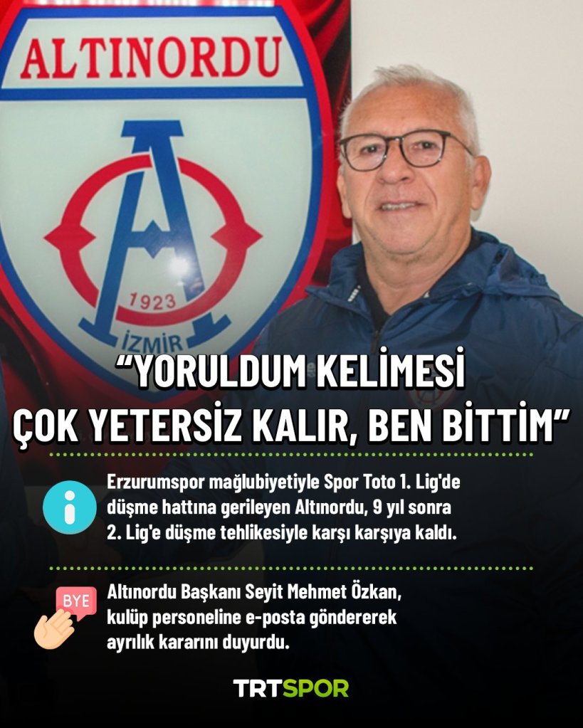 Altınordu Başkanı Seyit Mehmet Özkan: Yoruldum kelimesi çok yetersiz kalır, ben bittim. Dedi. İstifa Etti.