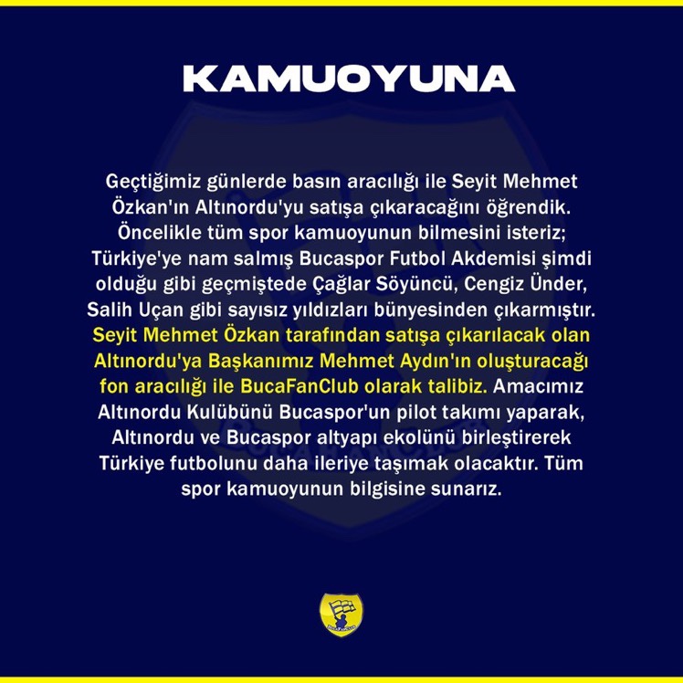 Altınordu:2012’den beri kulübümüzün futbol haklarını elinde bulunduran Altınordu Futbol Yatırımları A.Ş. misyon ve vizyonumuza uygun olan yatırımcılarla görüşerek, kulübümüzün futbol haklarını yakın zamanda devredecektir.Bu süreç boyunca tüm sportif ve ticari faaliyetlerimiz ile futbol okullarımız çalışmalarına aynen devam edecektir.Başkanımız bu toprakların çocukları ile ilgilenmeye devam edecektir.Gelişmeleri kamuoyu ile paylaşmayı sürdüreceğiz.Saygıyla duyurulur.