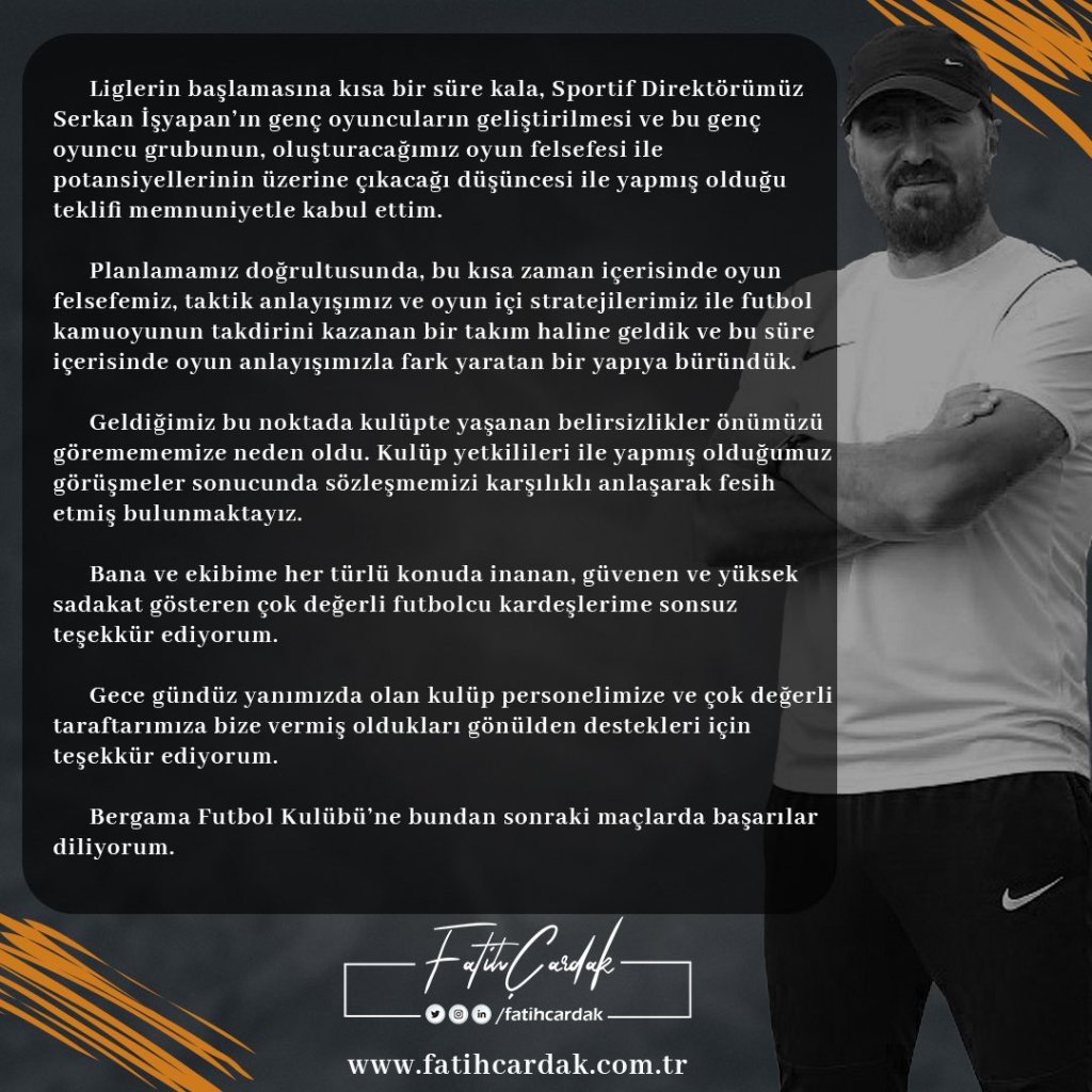 TFF 3.Lig 3.Grup Ekibi Bergama FK Teknik Direktörü Fatih Çardak İstifa Etti.