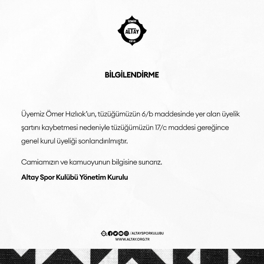 Altay Eski Başkanı Ömer Hızlıok İhraç Edildi. Altay Resmi Sayfası Açıklama Yaptı.