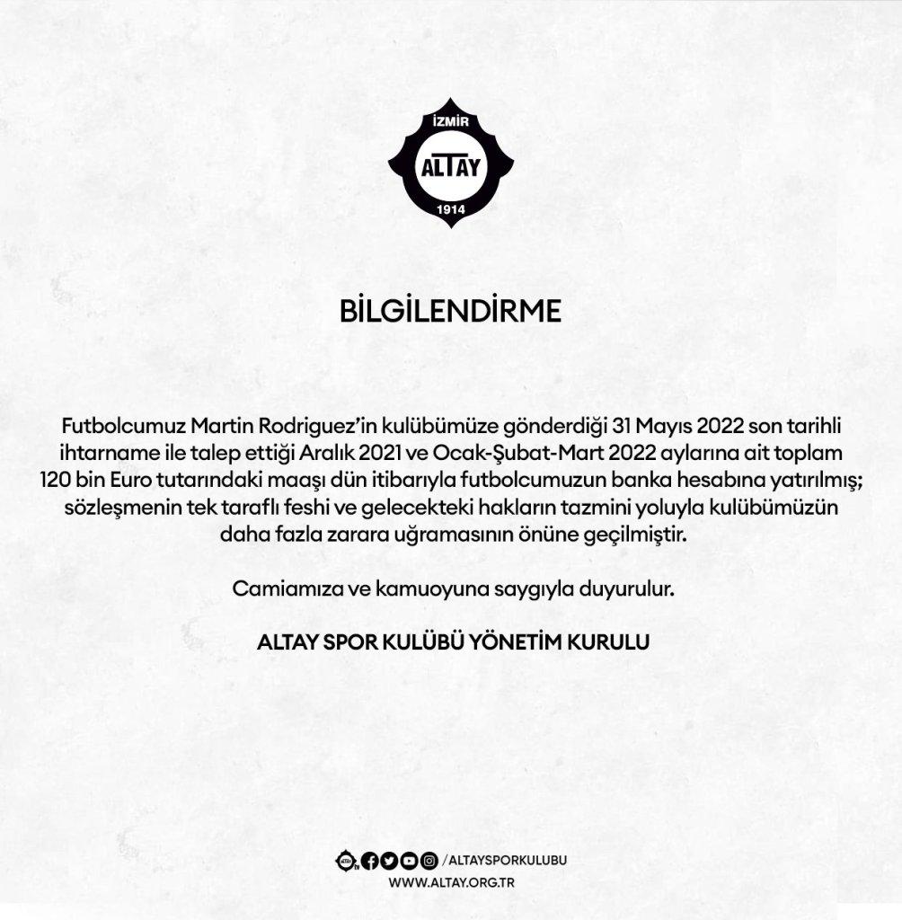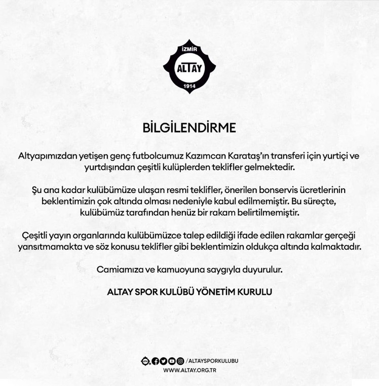 Camiamıza ve kamuoyuna saygıyla duyurulur. Altay Spor Kulübü Yönetim Kurulu