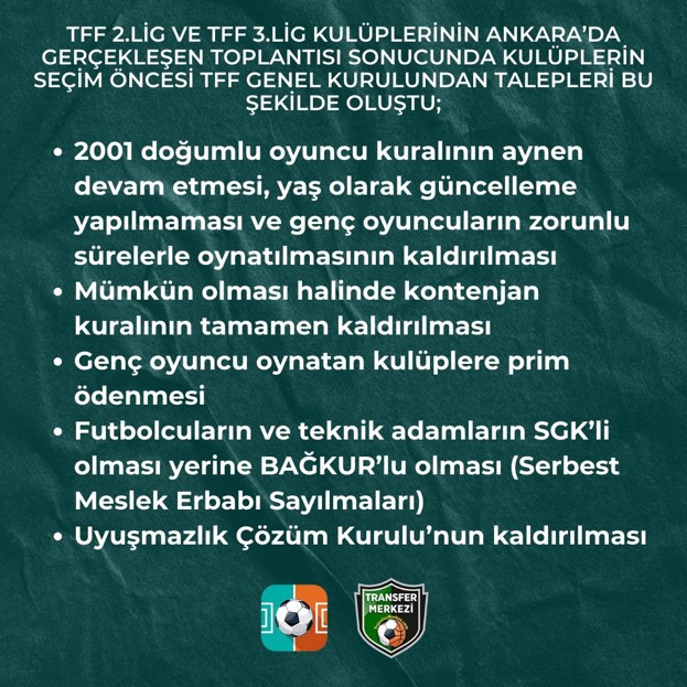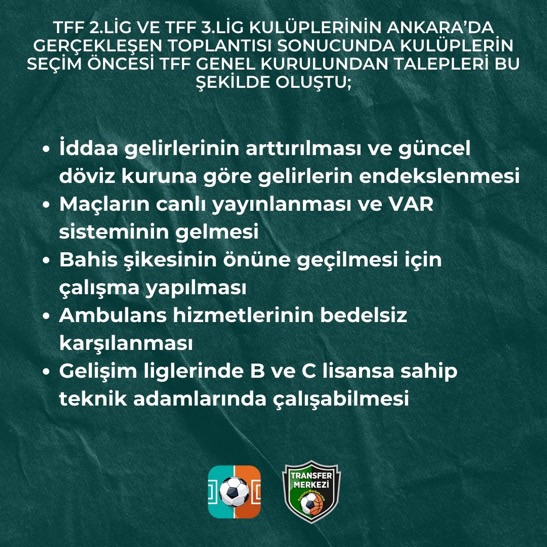 Alt Ligler X Hesabı Özel Haberin Göre:TFF 2. Lig ve TFF 3. Lig kulüplerinin Ankara’da gerçekleşen toplantısı sonucunda seçim öncesi TFF Genel Kurulundan talepleri belli oldu.