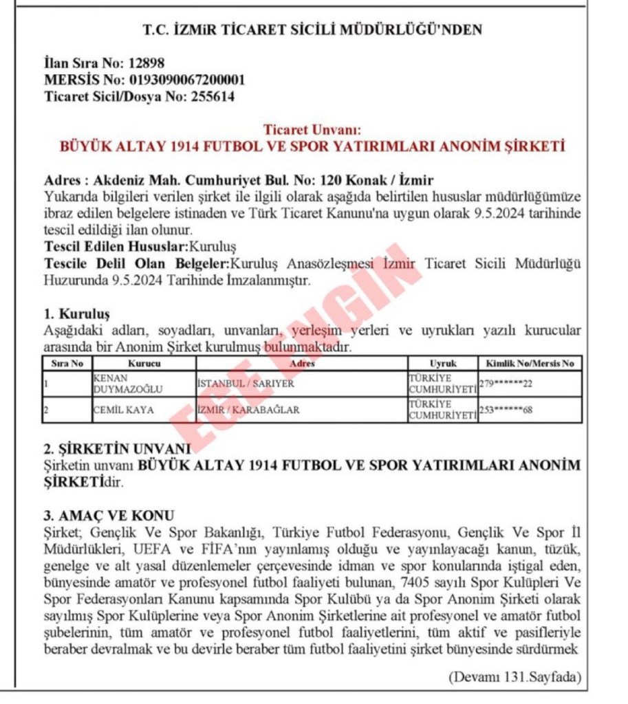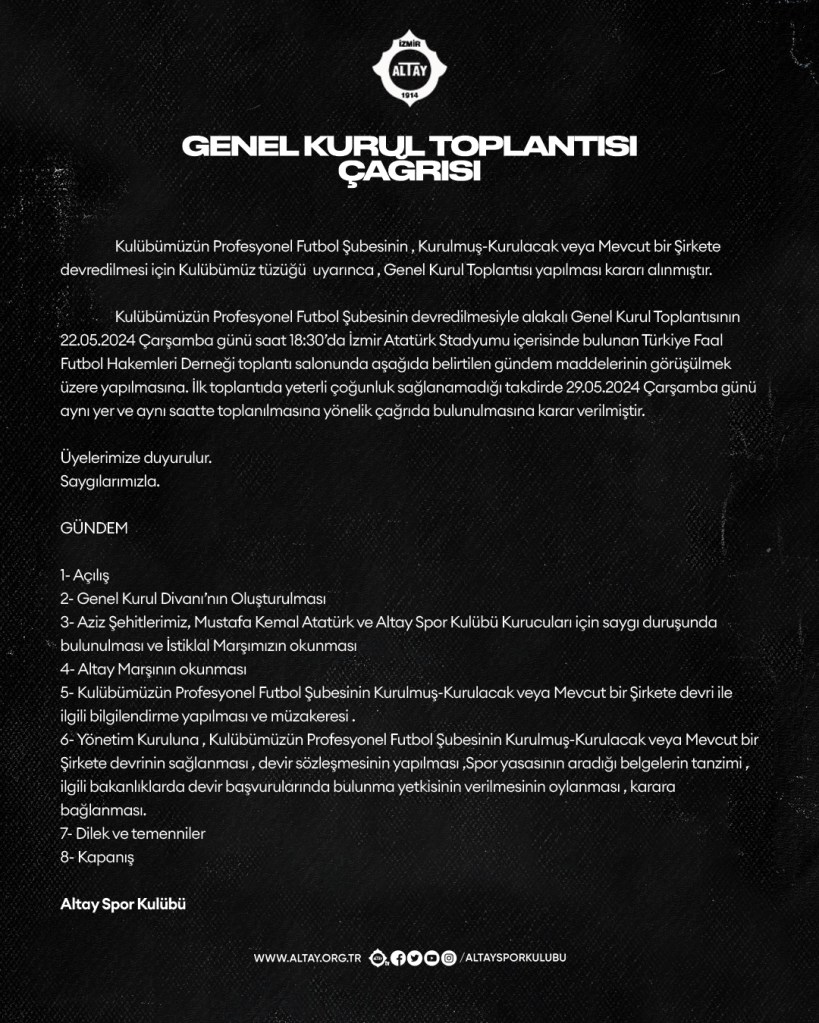 Altay Spor Kulübü şirketleşme dönemi ile ilgili bilgilendirme toplantısı Perşembe günü saat 10.00’da yapılacak.