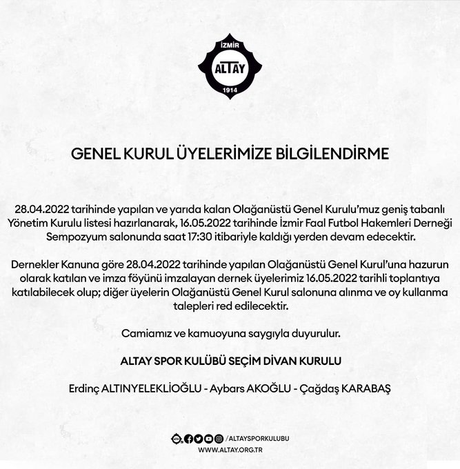 28.04.2022 tarihinde yapılan ve yarıda kalan Olağanüstü Genel Kurulu’muz geniş tabanlı Yönetim Kurulu listesi hazırlanarak, 16.05.2022 tarihinde İzmir Faal Futbol Hakemleri Derneği Sempozyum salonunda saat 17:30 itibariyle kaldığı yerden devam edecektir.