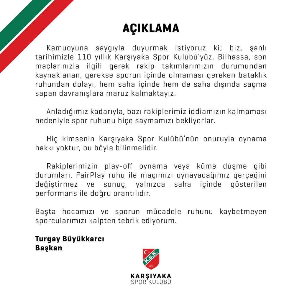 İzmir ekibinde teknik direktör Recep Yazıcı, mücadeleyi sonuna kadar sürdüreceklerini söyledi. Kazanmaları gereken maçtan 1 puanla ayrıldıklarını belirten deneyimli teknik adam, “Evimizde 2 puan bırakmak iyi olmadı. Bu hafta Denizlispor ile deplasmanda çok kritik maça çıkacağız. Umudumuz her zaman var ve mücadeleden asla vazgeçemeyiz” dedi.