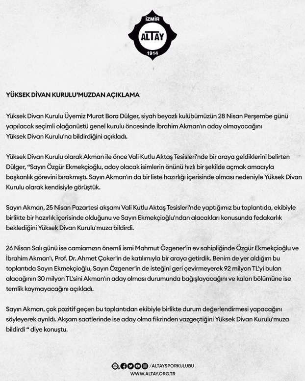 Sayın İbrahim Akman’ın da bir liste hazırlığı içerisinde olması nedeniyle Yüksek Divan Kurulu olarak kendisiyle görüştük. Sayın İbrahim Akman, 25 Nisan Pazartesi akşamı Vali Kutlu Aktaş Tesisleri’nde yaptığımız bu toplantıda, ekibiyle birlikte bir hazırlık içerisinde olduğunu ve Sayın Özgür Ekmekçioğlu’ndan alacakları konusunda fedakarlık beklediğini Yüksek Divan Kurulu’muza bildirdi.