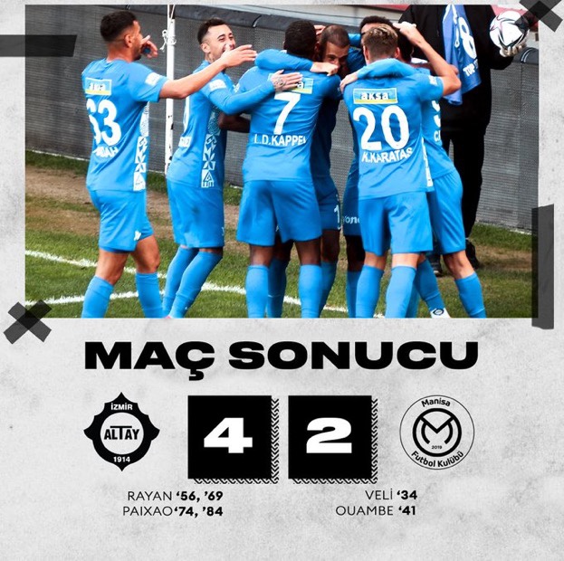 Altay 5.Tur Yükseldi. ZTK 4.Tur Altay-Manisa FK 4-2 34.Veli Çetin 41.Ouambe 56.Rayan 69.Rayan 74.Paıxao 84.Paıxao Başka Golü Olmadı. Altay 5.Tur Yükseldi. Kerim Küçük.